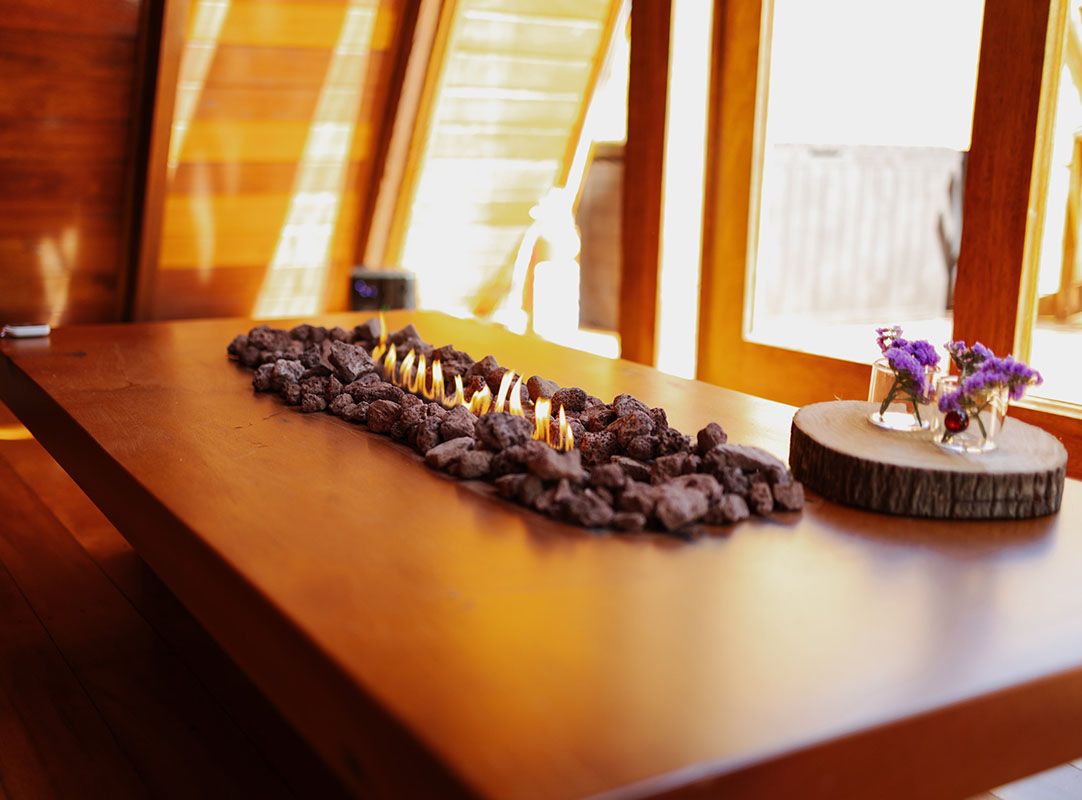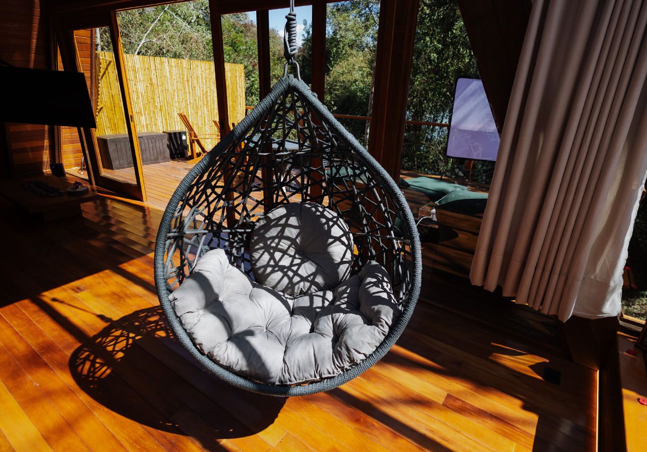 Com arquitetura icônica no formato A-frame e 120 m² voltados para a represa, a Cabana Horizonte combina elegância e contato com a natureza. Sua banheira de hidromassagem com cromoterapia e teto de vidro permite relaxar sob a luz das estrelas. O cinema no deck com Netflix, o sofá reclinável elétrico e a lareira interna a gás garantem conforto absoluto. A cama king e o chuveiro duplo a gás tornam a estadia ainda mais especial. No exterior, o espaço de fogueira convida para noites aquecidas com vista para a água.