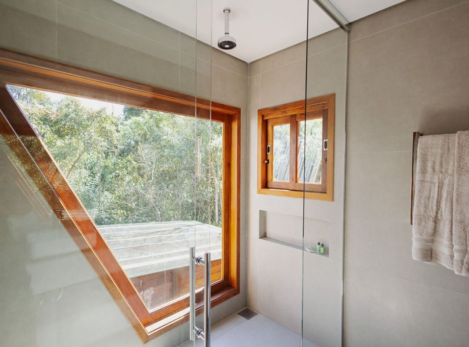 O banheiro panorâmico da Cabana Horizonte oferece um cenário inesquecível, com chuveiro duplo a gás e vista privilegiada para a mata. Um espaço de luxo que transforma o simples ato de relaxar em uma experiência de conexão com a natureza.