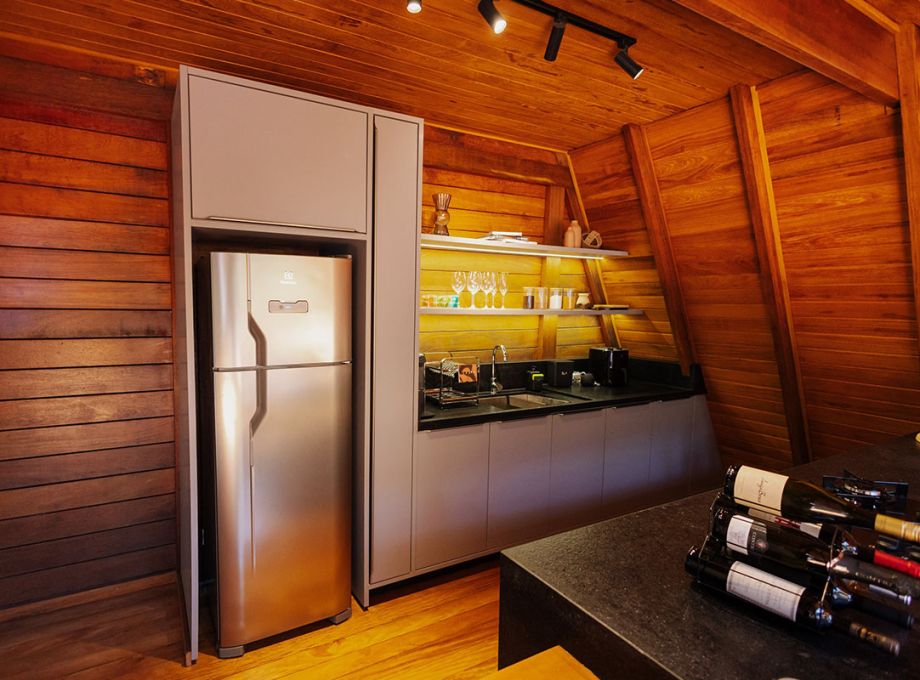 A cabana conta com uma cozinha completa, equipada com utensílios modernos e todos os recursos necessários para preparar suas refeições com conforto, seja um café da manhã tranquilo ou um jantar especial.