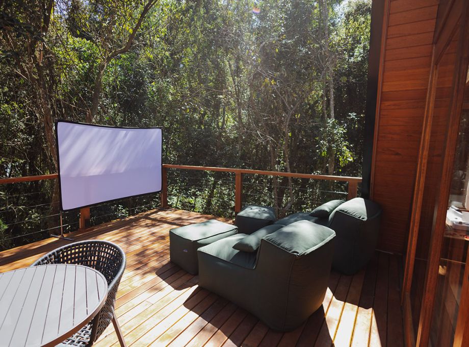 O cinema externo da cabana oferece uma experiência única sob as estrelas. Assista aos seus filmes e séries favoritos em meio à natureza, combinando entretenimento, conforto e momentos inesquecíveis.